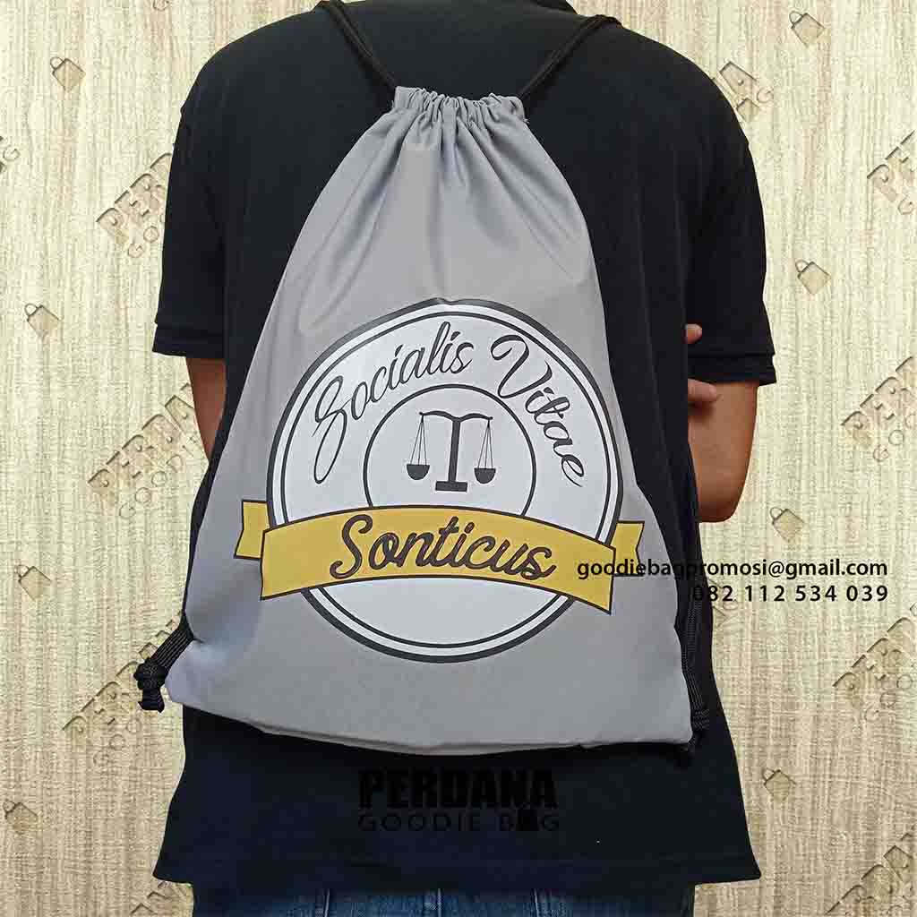 Sebagai informasi tambahan untuk spesifikasi, model tas serut bahan taslan warna abu abu, tali kur hitam, ukuran 40x30cm desain sablon sebanyak 2 warna 1 sisi tas. Tas yang dibuat berdasarkan sesuai dengan permintaan klien baik ukuran, warna dan desain dan warnanya. Lama pengerjaan untuk tas sebanyak 5000 pcs estimasi 14/21 hari Kerja. Untuk anda yang ingin menanyakan harga dan detail dan cara pemesanan bisa langsung datang ke kantor kami atau bisa juga via email dan whatsapp.